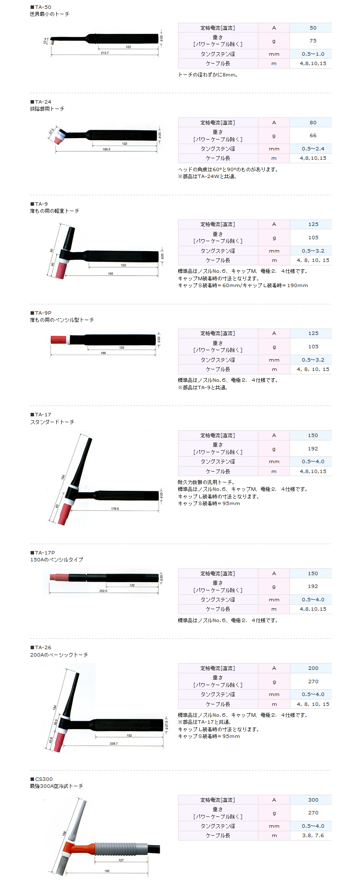 TOKINARC トーキン 半自動空冷TIGトーチ TA-50,TA-24,TA-9,TA-9P,TA-17,TA-17P,TA-26,CS300,TA-50 ・CS300 ・TA-18SP ・TA-27AAC ・TA-22B ・TTG Plus